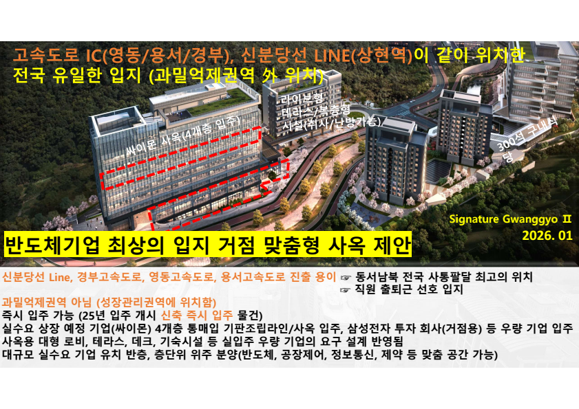 대규모 실수요 기업 유치: 반도체, 공장제어, 정보통신, 제약 등 맞춤 공간 구성을 위한 반층, 층단위 위주 분양 가능